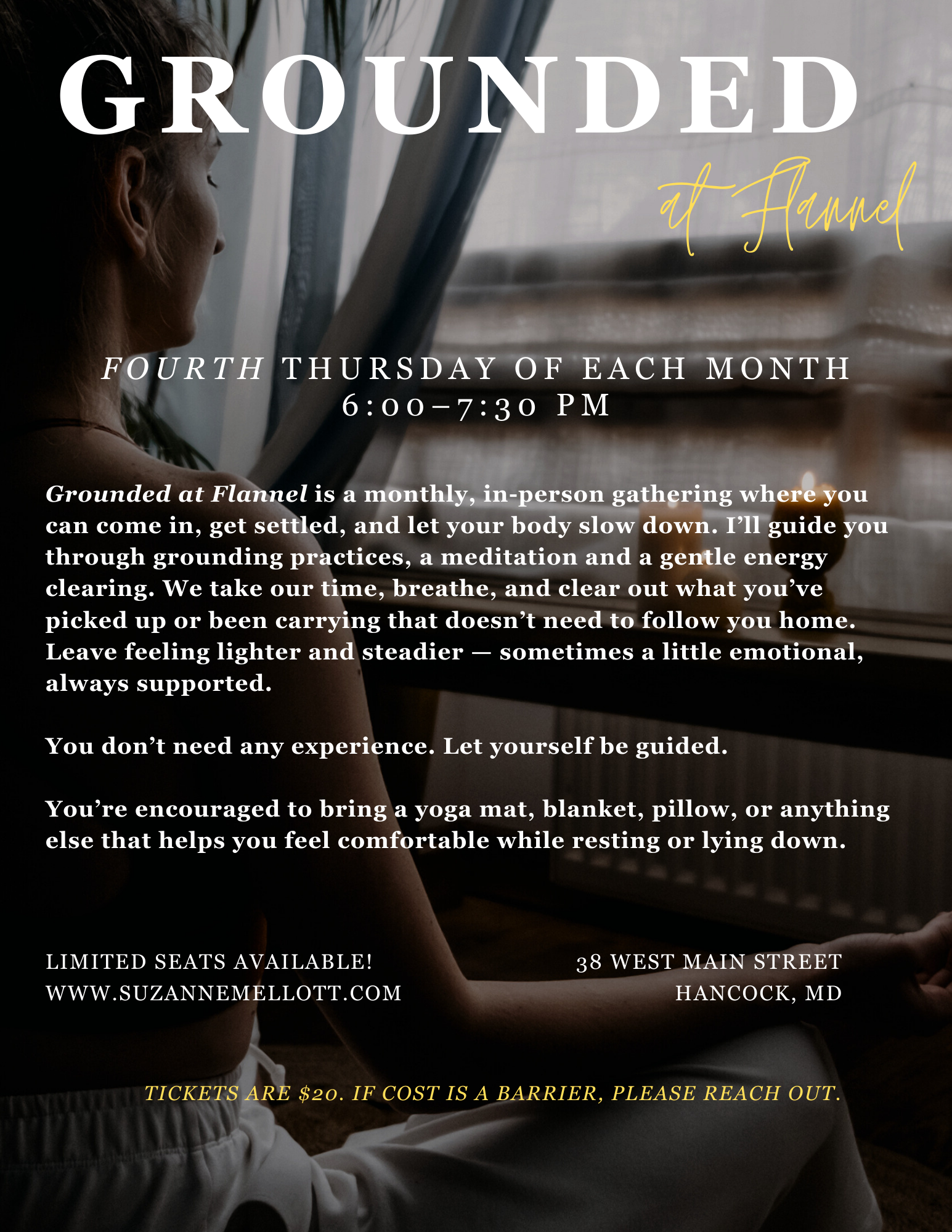 Grounded at Flannel is a monthly, in-person gathering where you can come in, get settled, and let your body slow down. I’ll guide you through grounding practices, a meditation and a gentle energy clearing. We take our time, breathe, and clear out what you’ve picked up or been carrying that doesn’t need to follow you home. Leave feeling lighter and steadier — sometimes a little emotional, always supported.