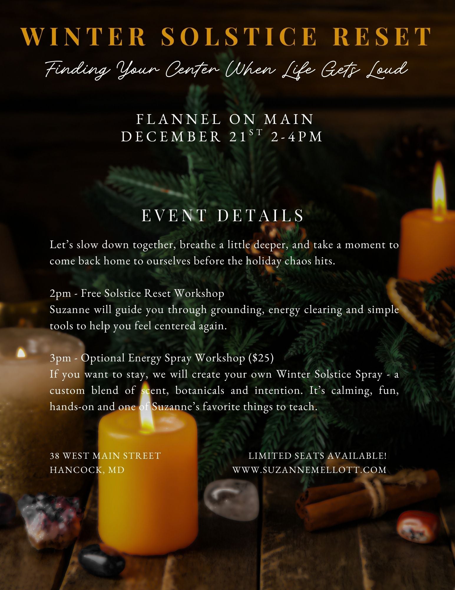 If you want to stay, we will create your own Winter Solstice Spray - a custom blend of scent, botanicals and intention. It’s calming, fun, hands-on and one of Suzanne’s favorite things to teach.